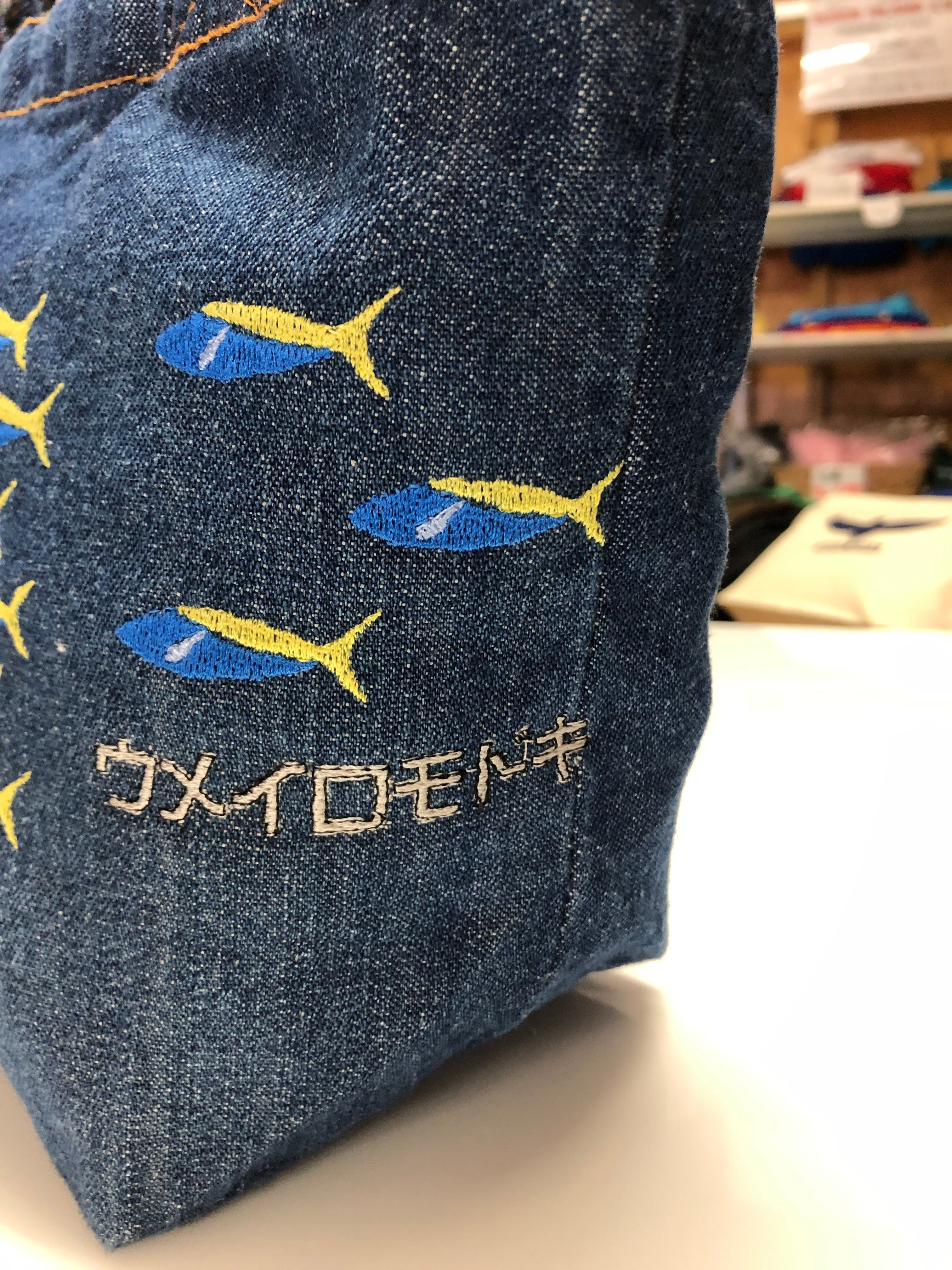■002 刺繍バック デニム 紺色 ウメイロモドキ 片面